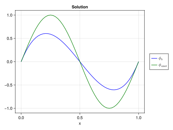 ϕ⁰ = Forms.build_form_field(Λ⁰, sol)Mantis.Forms.FormField{1, 0, Mantis.Forms.FormSpace{1, 0, Mantis.FunctionSpaces.BSplineSpace{Mantis.FunctionSpaces.Bernstein, Mantis.Geometry.CartesianGeometry{1, 1, 1, Tuple{Tuple{LinRange{Float64, Int64}}}, Tuple{CartesianIndices{1, Tuple{Base.OneTo{Int64}}}}, Tuple{LinearIndices{1, Tuple{Base.OneTo{Int64}}}}}, Mantis.Geometry.CartesianGeometry{1, 1, 1, Tuple{Tuple{LinRange{Float64, Int64}}}, Tuple{CartesianIndices{1, Tuple{Base.OneTo{Int64}}}}, Tuple{LinearIndices{1, Tuple{Base.OneTo{Int64}}}}}, Vector{Int64}, Matrix{Float64}, UnitRange{Int64}, UnitRange{Int64}, Vector{Vector{Vector{Int64}}}}, LaTeXStrings.LaTeXString}, LaTeXStrings.LaTeXString}(Mantis.Forms.FormSpace{1, 0, Mantis.FunctionSpaces.BSplineSpace{Mantis.FunctionSpaces.Bernstein, Mantis.Geometry.CartesianGeometry{1, 1, 1, Tuple{Tuple{LinRange{Float64, Int64}}}, Tuple{CartesianIndices{1, Tuple{Base.OneTo{Int64}}}}, Tuple{LinearIndices{1, Tuple{Base.OneTo{Int64}}}}}, Mantis.Geometry.CartesianGeometry{1, 1, 1, Tuple{Tuple{LinRange{Float64, Int64}}}, Tuple{CartesianIndices{1, Tuple{Base.OneTo{Int64}}}}, Tuple{LinearIndices{1, Tuple{Base.OneTo{Int64}}}}}, Vector{Int64}, Matrix{Float64}, UnitRange{Int64}, UnitRange{Int64}, Vector{Vector{Vector{Int64}}}}, LaTeXStrings.LaTeXString}(Mantis.FunctionSpaces.BSplineSpace{Mantis.FunctionSpaces.Bernstein, Mantis.Geometry.CartesianGeometry{1, 1, 1, Tuple{Tuple{LinRange{Float64, Int64}}}, Tuple{CartesianIndices{1, Tuple{Base.OneTo{Int64}}}}, Tuple{LinearIndices{1, Tuple{Base.OneTo{Int64}}}}}, Mantis.Geometry.CartesianGeometry{1, 1, 1, Tuple{Tuple{LinRange{Float64, Int64}}}, Tuple{CartesianIndices{1, Tuple{Base.OneTo{Int64}}}}, Tuple{LinearIndices{1, Tuple{Base.OneTo{Int64}}}}}, Vector{Int64}, Matrix{Float64}, UnitRange{Int64}, UnitRange{Int64}, Vector{Vector{Vector{Int64}}}}(Mantis.Geometry.CartesianGeometry{1, 1, 1, Tuple{Tuple{LinRange{Float64, Int64}}}, Tuple{CartesianIndices{1, Tuple{Base.OneTo{Int64}}}}, Tuple{LinearIndices{1, Tuple{Base.OneTo{Int64}}}}}(((LinRange{Float64}(0.0, 1.0, 3),),), (CartesianIndices((2,)),), (LinearIndices((Base.OneTo(2),)),)), Mantis.FunctionSpaces.KnotVector{Mantis.Geometry.CartesianGeometry{1, 1, 1, Tuple{Tuple{LinRange{Float64, Int64}}}, Tuple{CartesianIndices{1, Tuple{Base.OneTo{Int64}}}}, Tuple{LinearIndices{1, Tuple{Base.OneTo{Int64}}}}}, Vector{Int64}}(Mantis.Geometry.CartesianGeometry{1, 1, 1, Tuple{Tuple{LinRange{Float64, Int64}}}, Tuple{CartesianIndices{1, Tuple{Base.OneTo{Int64}}}}, Tuple{LinearIndices{1, Tuple{Base.OneTo{Int64}}}}}(((LinRange{Float64}(0.0, 1.0, 3),),), (CartesianIndices((2,)),), (LinearIndices((Base.OneTo(2),)),)), 3, [4, 1, 4]), Mantis.FunctionSpaces.Bernstein(3), Mantis.FunctionSpaces.ExtractionOperator{1, Matrix{Float64}, UnitRange{Int64}, UnitRange{Int64}}([([1.0 0.0 0.0 0.0; 0.0 1.0 0.0 0.0; 0.0 0.5 0.5 0.0; 0.0 0.25 0.5 0.25],), ([0.25 0.5 0.25 0.0; 0.0 0.5 0.5 0.0; 0.0 0.0 1.0 0.0; 0.0 0.0 0.0 1.0],)], Mantis.FunctionSpaces.Indices{1, UnitRange{Int64}, UnitRange{Int64}}[Mantis.FunctionSpaces.Indices{1, UnitRange{Int64}, UnitRange{Int64}}(1:4, (1:4,)), Mantis.FunctionSpaces.Indices{1, UnitRange{Int64}, UnitRange{Int64}}(2:5, (1:4,))], 2, 5), [[[1], [2, 3, 4], [5]]]), L"$\phi_h$"), [0.0, 1.0469646794854808, 6.21724893790088e-15, -1.0469646794854761, 0.0], L"$\phi_h$")We want to plot the computed solution next to the exact solution, so we also create a FormField for the exact solution.