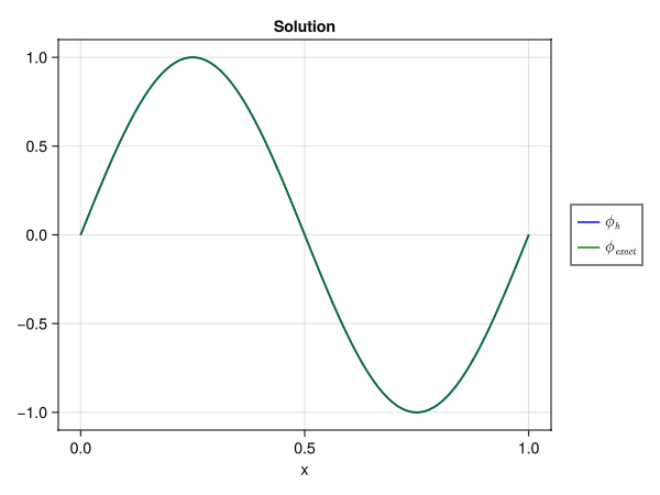 ϕ⁰ = Forms.build_form_field(Λ⁰, sol)Mantis.Forms.FormField{1, 0, Mantis.Forms.FormSpace{1, 0, Mantis.FunctionSpaces.BSplineSpace{Mantis.FunctionSpaces.Bernstein, Mantis.Geometry.CartesianGeometry{1, 1, 1, Tuple{Tuple{LinRange{Float64, Int64}}}, Tuple{CartesianIndices{1, Tuple{Base.OneTo{Int64}}}}, Tuple{LinearIndices{1, Tuple{Base.OneTo{Int64}}}}}, Mantis.Geometry.CartesianGeometry{1, 1, 1, Tuple{Tuple{LinRange{Float64, Int64}}}, Tuple{CartesianIndices{1, Tuple{Base.OneTo{Int64}}}}, Tuple{LinearIndices{1, Tuple{Base.OneTo{Int64}}}}}, Vector{Int64}, Matrix{Float64}, UnitRange{Int64}, UnitRange{Int64}, Vector{Vector{Vector{Int64}}}}, LaTeXStrings.LaTeXString}, LaTeXStrings.LaTeXString}(Mantis.Forms.FormSpace{1, 0, Mantis.FunctionSpaces.BSplineSpace{Mantis.FunctionSpaces.Bernstein, Mantis.Geometry.CartesianGeometry{1, 1, 1, Tuple{Tuple{LinRange{Float64, Int64}}}, Tuple{CartesianIndices{1, Tuple{Base.OneTo{Int64}}}}, Tuple{LinearIndices{1, Tuple{Base.OneTo{Int64}}}}}, Mantis.Geometry.CartesianGeometry{1, 1, 1, Tuple{Tuple{LinRange{Float64, Int64}}}, Tuple{CartesianIndices{1, Tuple{Base.OneTo{Int64}}}}, Tuple{LinearIndices{1, Tuple{Base.OneTo{Int64}}}}}, Vector{Int64}, Matrix{Float64}, UnitRange{Int64}, UnitRange{Int64}, Vector{Vector{Vector{Int64}}}}, LaTeXStrings.LaTeXString}(Mantis.FunctionSpaces.BSplineSpace{Mantis.FunctionSpaces.Bernstein, Mantis.Geometry.CartesianGeometry{1, 1, 1, Tuple{Tuple{LinRange{Float64, Int64}}}, Tuple{CartesianIndices{1, Tuple{Base.OneTo{Int64}}}}, Tuple{LinearIndices{1, Tuple{Base.OneTo{Int64}}}}}, Mantis.Geometry.CartesianGeometry{1, 1, 1, Tuple{Tuple{LinRange{Float64, Int64}}}, Tuple{CartesianIndices{1, Tuple{Base.OneTo{Int64}}}}, Tuple{LinearIndices{1, Tuple{Base.OneTo{Int64}}}}}, Vector{Int64}, Matrix{Float64}, UnitRange{Int64}, UnitRange{Int64}, Vector{Vector{Vector{Int64}}}}(Mantis.Geometry.CartesianGeometry{1, 1, 1, Tuple{Tuple{LinRange{Float64, Int64}}}, Tuple{CartesianIndices{1, Tuple{Base.OneTo{Int64}}}}, Tuple{LinearIndices{1, Tuple{Base.OneTo{Int64}}}}}(((LinRange{Float64}(0.0, 1.0, 3),),), (CartesianIndices((2,)),), (LinearIndices((Base.OneTo(2),)),)), Mantis.FunctionSpaces.KnotVector{Mantis.Geometry.CartesianGeometry{1, 1, 1, Tuple{Tuple{LinRange{Float64, Int64}}}, Tuple{CartesianIndices{1, Tuple{Base.OneTo{Int64}}}}, Tuple{LinearIndices{1, Tuple{Base.OneTo{Int64}}}}}, Vector{Int64}}(Mantis.Geometry.CartesianGeometry{1, 1, 1, Tuple{Tuple{LinRange{Float64, Int64}}}, Tuple{CartesianIndices{1, Tuple{Base.OneTo{Int64}}}}, Tuple{LinearIndices{1, Tuple{Base.OneTo{Int64}}}}}(((LinRange{Float64}(0.0, 1.0, 3),),), (CartesianIndices((2,)),), (LinearIndices((Base.OneTo(2),)),)), 3, [4, 1, 4]), Mantis.FunctionSpaces.Bernstein(3), Mantis.FunctionSpaces.ExtractionOperator{1, Matrix{Float64}, UnitRange{Int64}, UnitRange{Int64}}([([1.0 0.0 0.0 0.0; 0.0 1.0 0.0 0.0; 0.0 0.5 0.5 0.0; 0.0 0.25 0.5 0.25],), ([0.25 0.5 0.25 0.0; 0.0 0.5 0.5 0.0; 0.0 0.0 1.0 0.0; 0.0 0.0 0.0 1.0],)], Mantis.FunctionSpaces.Indices{1, UnitRange{Int64}, UnitRange{Int64}}[Mantis.FunctionSpaces.Indices{1, UnitRange{Int64}, UnitRange{Int64}}(1:4, (1:4,)), Mantis.FunctionSpaces.Indices{1, UnitRange{Int64}, UnitRange{Int64}}(2:5, (1:4,))], 2, 5), [[[1], [2, 3, 4], [5]]]), L"$\phi_h$"), [0.0, 1.0469646794854808, 6.21724893790088e-15, -1.0469646794854761, 0.0], L"$\phi_h$")We want to plot the computed solution next to the exact solution, so we also create a FormField for the exact solution.